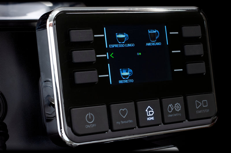 The Cadorna can produce 6 personalized beverages including ristretto, espresso, espresso lungo, coffee, Americano, and hot water.