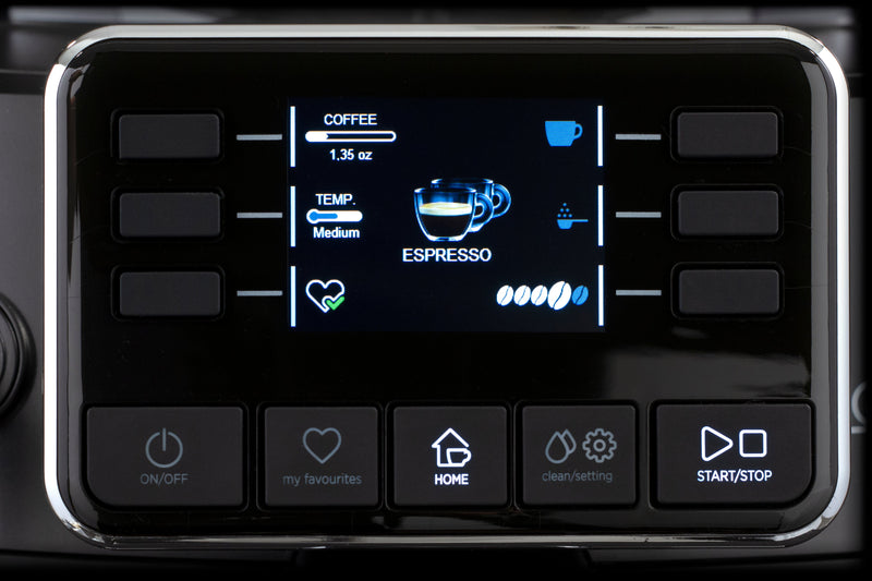 A vibrant TFT display presents each drink option colorfully, navigated by an array of tactile buttons.