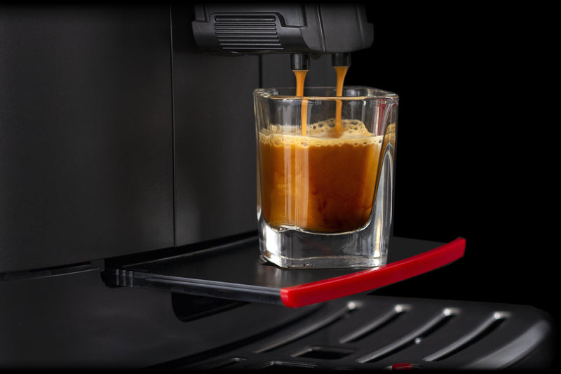 A specialized tray slides forward to provide a space for an espresso cup closer to the spouts, ensuring the crema is not broken apart during extraction.